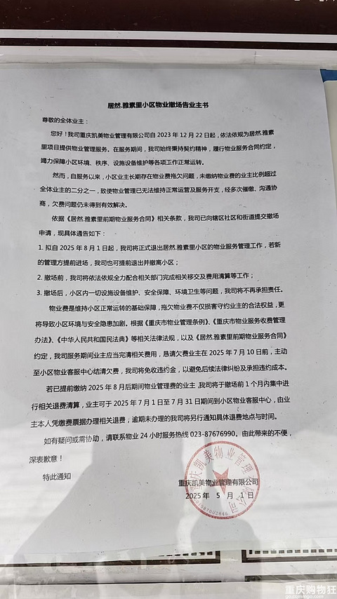 上个月重庆至少5家物业公司主动撤出,物业公司的大浪淘沙开始了。 5月1日,居然雅素里小区物业公司凯美物业发布撤场告业主书,提出将从8月1日起退出该小区物业管理工作;5月10日,巴南花语佰骊小区,物业公司表示从“提供服务之日起一直处于收不抵支,并在2024年下半年开始,亏损进一步扩大”,决定8月15日终止服务;5月21日,沙坪坝春华秋实小区二期,小区物业费降费幅度太大,物业公司“无法接受”,决定退出