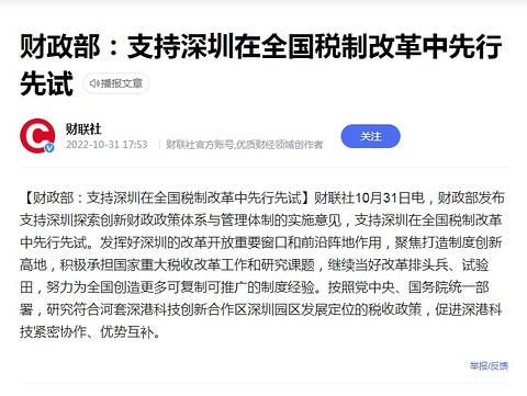 财政部:支持深圳在全国税制改革中先行先试