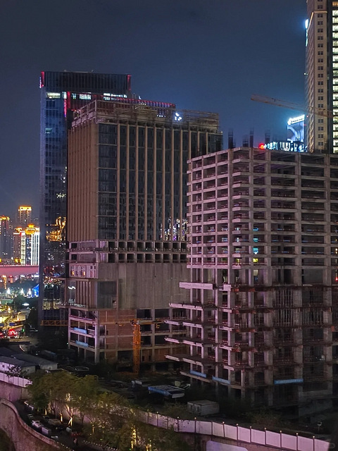 在看洪崖洞夜景的时候,一转身发现江边还有两个烂尾楼,这么好的地段居然有两栋这么大的烂尾楼,是什么情况啊?