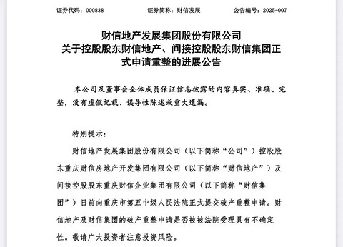2月4日,昔日“重庆五虎”之一的财信地产及重庆财信集团正式向法院申请破产重整。 百强房企主动重整。 据财信发展公告显示,控股股东财信地产及简介控股股东财信集团已向重庆市第五中级人民法院提交破产重整申请,案号分别为《(2025)渝05破申84号》和《(2025)渝05破申88号》。