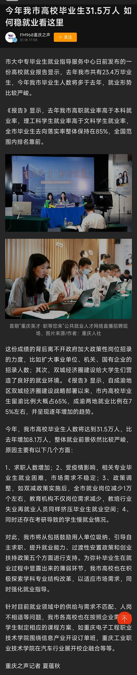 工作不好找哦,一年31.5万毕业生,还好只有65%留到重庆。