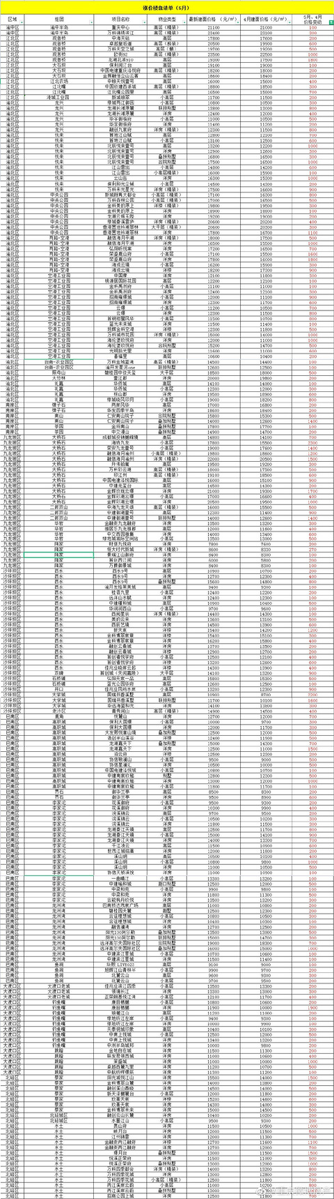 在所统计的主城461个在售楼盘中,较之4月共有220个楼盘的产品价格没有变化,241个楼盘的产品价格有调整。而在这241个调价楼盘中,调涨楼盘有218个,占比约90%,平均涨幅约532元/㎡。最后附一张调涨楼盘明细清单,供有需求的各位保存! ?