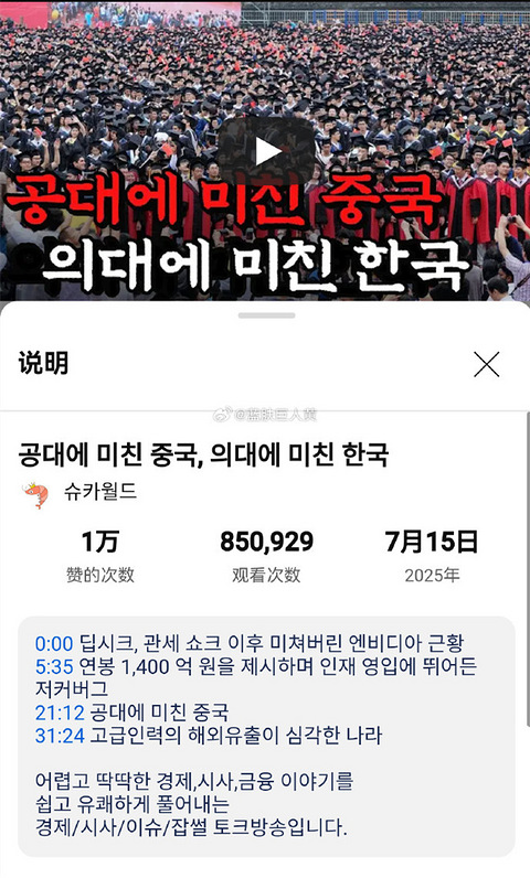 给大家看一点韩国kbs纪录片《人才战争:为工科疯狂的中国》底下韩国网友的评论,真实感受一下韩国人看完纪录片后扑面而来的恐慌感—— (原版的纪录片被锁了ip,而且2.3万条评论也被关了,但是该节目组后来又做了一个二次剪辑和解读版,也有85万播放量,这些评论从改二次剪辑版中选取) ? 转自:蓝肤巨人黄