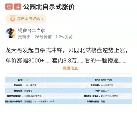 这两天逛购物狂的时候,发现了一个有意思的帖子。 这位龙大哥是何许人也?现在这个行情还涨到3万多,怪不得说是自杀式涨价。后来一看,这个龙大哥就是咱们本土的龙湖,而这个帖子中说的房子就是龙湖在中央公园的楼盘,这就不得不让我们想一个问题了,这个时候涨价是已经放弃挣扎了?还是中央公园现在已经到了快卖到来福士的价格了?大家觉得呢?