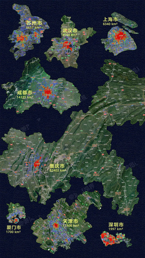 同比例下各城市热力图,重庆建成区是不是还有扩张的空间