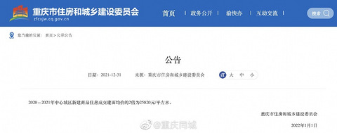 重庆市住房和城乡建设委员会官网公告,2020—2021年中心城区新建商品住房成交建面均价的2倍为25820元/平方米,落款时间为2022年1月1日。这意味着2022年重庆市对个人新购的高档住房征收房产税起征点为25820元/平方米