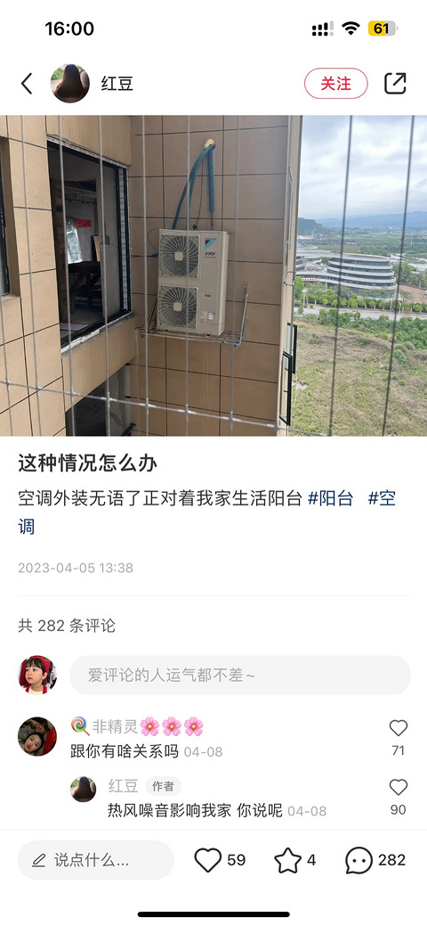 刷到一个博主求助她邻居装空调外机,在外墙上打孔安装,正对着博主家的生活阳台,估计是占用了原有的空调机位,一到夏天这热风吹起阳台不知道多热。。