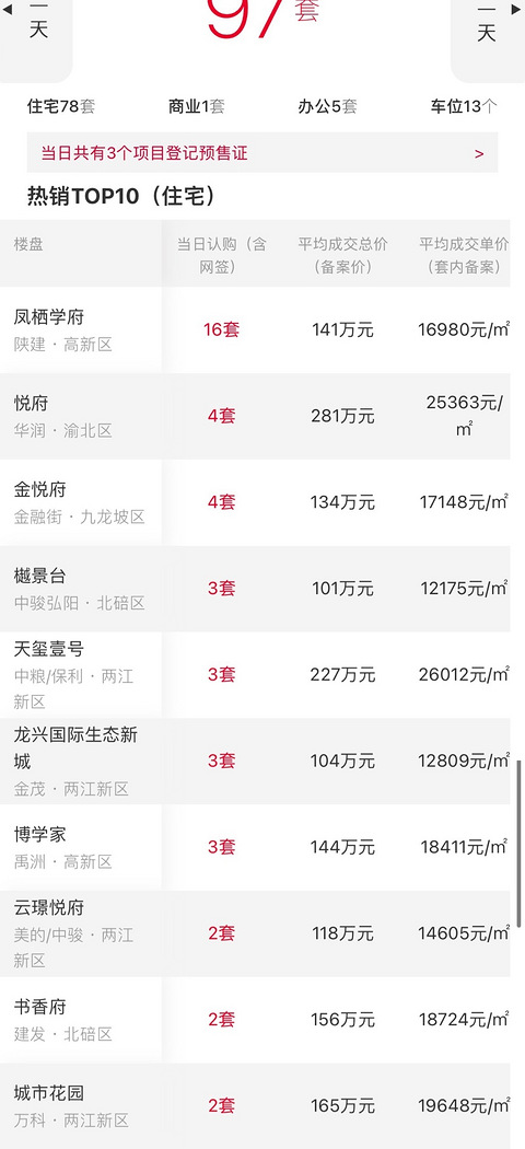 重庆主城过去3天网签排行榜