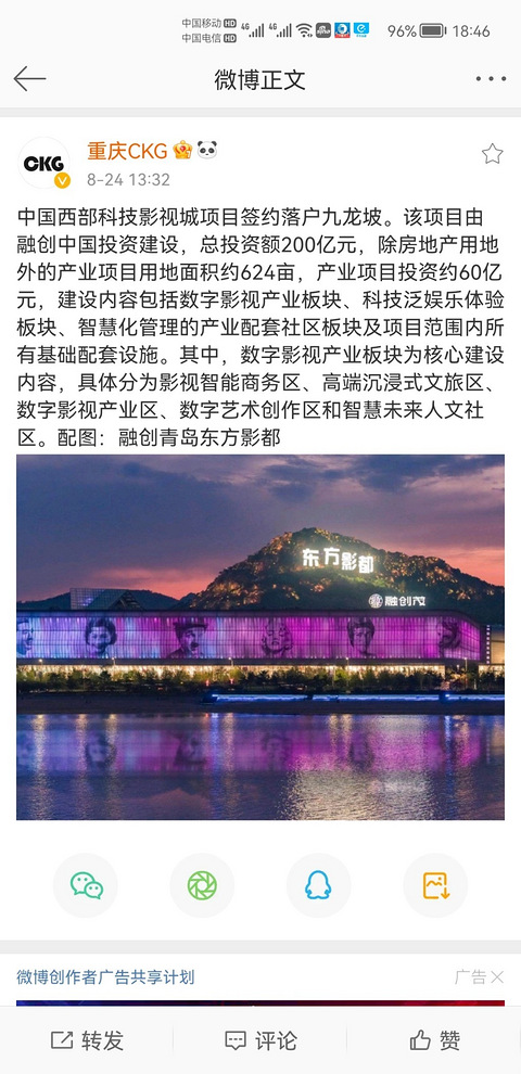 融创中迪有戏?融创投资西部科技影视城落户九龙坡
