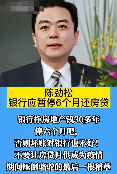 位著名的地产学家,企业家陈劲松icon呼吁,银行应暂停6个月还房贷,不要让房屋贷款成为疫情期间压垮骆驼的最后一根稻草,讲的情真意切,让广大的房奴大为感动。