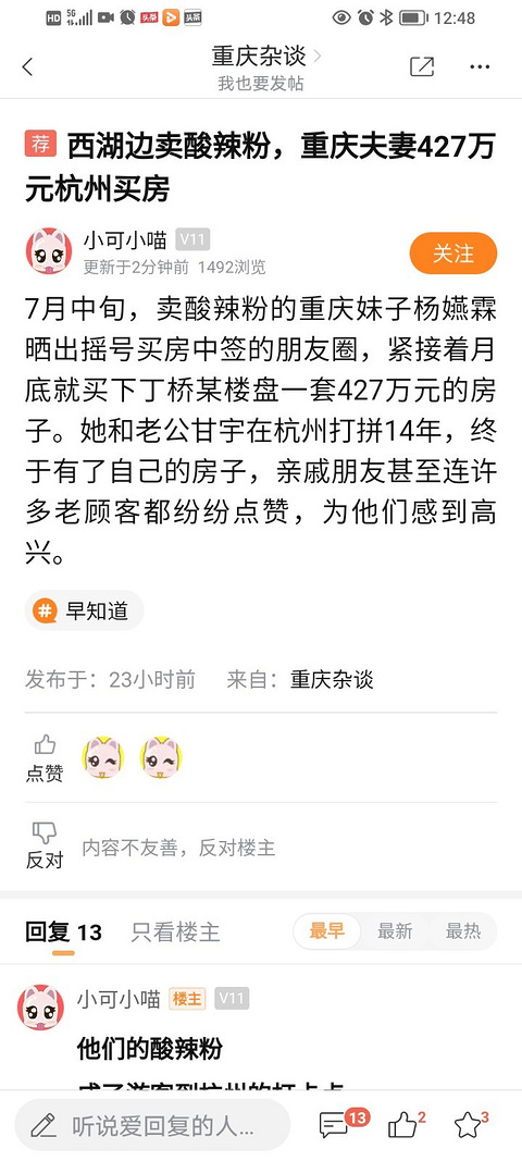 重庆农民夫妻杭州卖酸辣粉,425万杭州买房