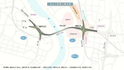 宝山嘉陵江大桥宝山嘉陵江大桥项目,是重庆快速路网体系“八横七纵一环九联络”中五联络线的咽喉工程,起于两江新区悦来片区,止于北碚区蔡家片区,全长约3.3公里,按城市快速路标准设计,双向8车道,设计时速80公里,含互通式立交2座(西桥头立交、椿萱立交),跨嘉陵江大桥1座(宝山嘉陵江大桥)。 项目建成后,可实现蔡家片区 10分钟内通达中央公园、江北机场等片区, 进一步缩短嘉陵江两岸组团之间的距离, 有效
