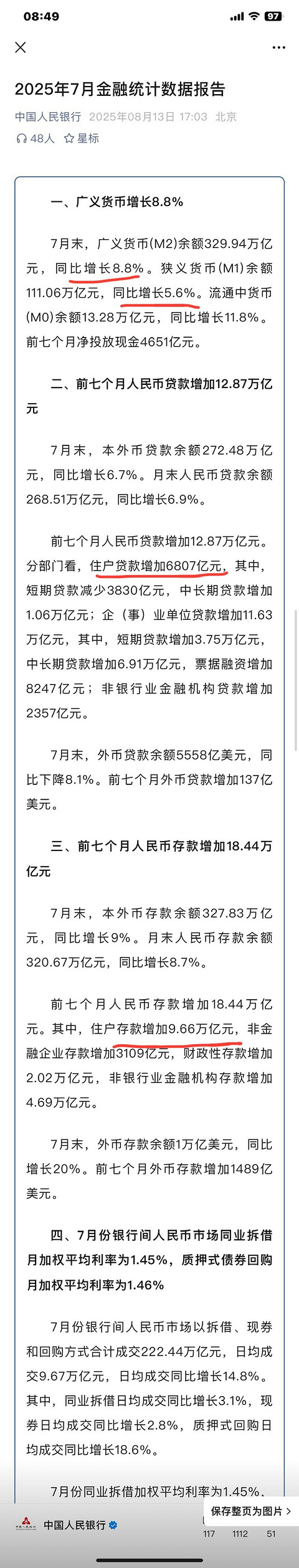 1-7月住户贷款累计增加6807亿元,7月单月减少5637亿元。担心房子涨价的看这一句就够了,夏小刀已经哭晕在厕所了。