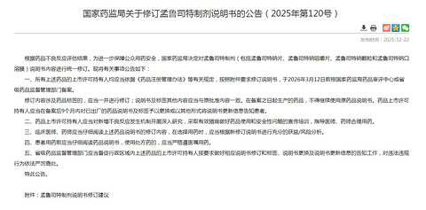 12月22日,这款为诸多家长所熟悉的儿童常用止咳药说明书进行了新一轮的修订。12月22日,国家药监局关于修订孟鲁司特制剂说明书的公告(2025年第120号)根据药品不良反应评估结果,为进一步保障公众用药安全,国家药监局决定对孟鲁司特制剂(包括孟鲁司特钠片、孟鲁司特钠咀嚼片、孟鲁司特钠颗粒和孟鲁司特钠口溶膜)说明书内容进行统一修订。