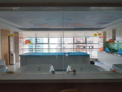 第十一届大肚妈咪考察团,预约了今天上午10:30到国宾妇产医疗级月子中心考察。首先是到医院1楼产科会员中心,会有专属工作人员带你参观。我们今天的参观流程是:25楼宝宝洗澡区+娱乐设施公区——21-23楼客房区——20楼产康区(了解套餐内容)——回到25楼餐厅试吃月子餐。先给大家看看25楼的情况,各个区域使用需要提前预约。这是宝宝洗澡和游泳的区域,可以同时有三位月嫂给各自负责的宝宝洗澡。瑜伽室:书吧