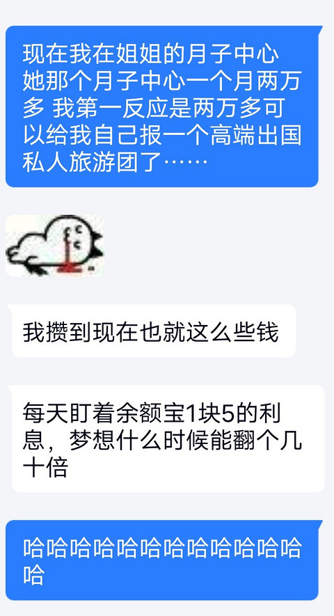 网友分享,自己的好友前段时间去了一趟月子中心看望刚生育的表姐她觉得花钱去月子中心坐月子好贵