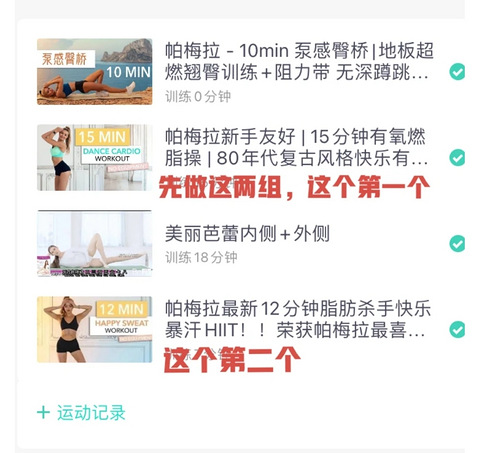 训练顺序:1.先做帕梅拉有氧跳操那两套第一套强度很低,第二套强度有点大,大家看情况!我昨天熬夜了今天就跳不动