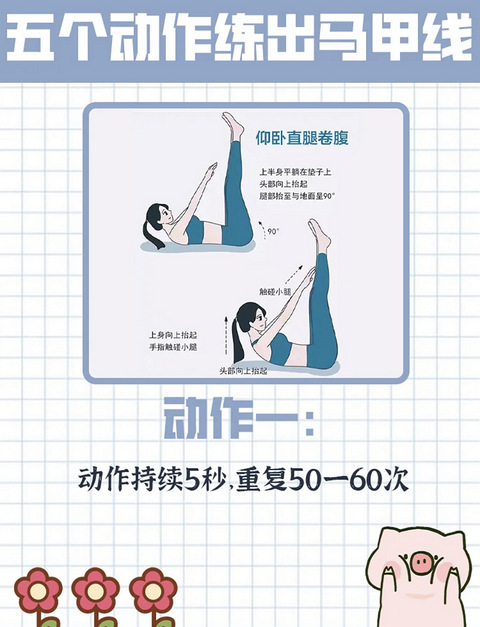 动作一:腹部一定要收紧,脚尖绷直先抬头再把双腿抬起来。手指去寻找小腿的方向。可以做3-4组,每组15个。