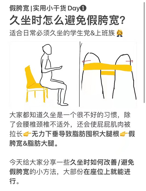 很多朋友说因为工作学习各方面导致无法避免久坐,但是久坐和坐着时候的不良姿势很容易会导致假胯宽!所以今天跟大家分享几个坐着时就能进行的小锻炼,能避免因为久坐导致的臀肌无力,将伤害最小化。大家看图看图,重点总结如下