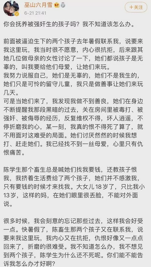 十几年前,巫山有一个女孩沦为童养媳。 其中忍受多少屈辱、非人的磨难。 一次偶然,她红了。 悲惨经历被铺天盖地报道。 她重获了自由。 只是,舆论消散之后,生活始终艰难。 “你会抚养被强奸生下来的孩子吗?”去年6月,马泮艳以这句话开头,更新一条微博。她详细说明了自己面临的困境。 前夫陈学生唆使两个孩子问自己拿钱。 孩子是被迫生下来的。对孩子父亲只有仇恨,对孩子也没有一丝母爱。 暑假期间,两个孩子要来