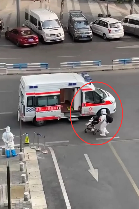 这位妈妈怀里是一个吃奶阶段的小婴儿,还用推车推着一个看起来一两岁的婴儿。可能是怀里宝宝哭闹,这位妈妈还停下来安抚。但旁边的大白们无人上前帮忙搭手。旁边这些大白,就不能帮忙搭把手吗?这种特殊情况,难道就不能特殊处理让她们居家隔离吗?