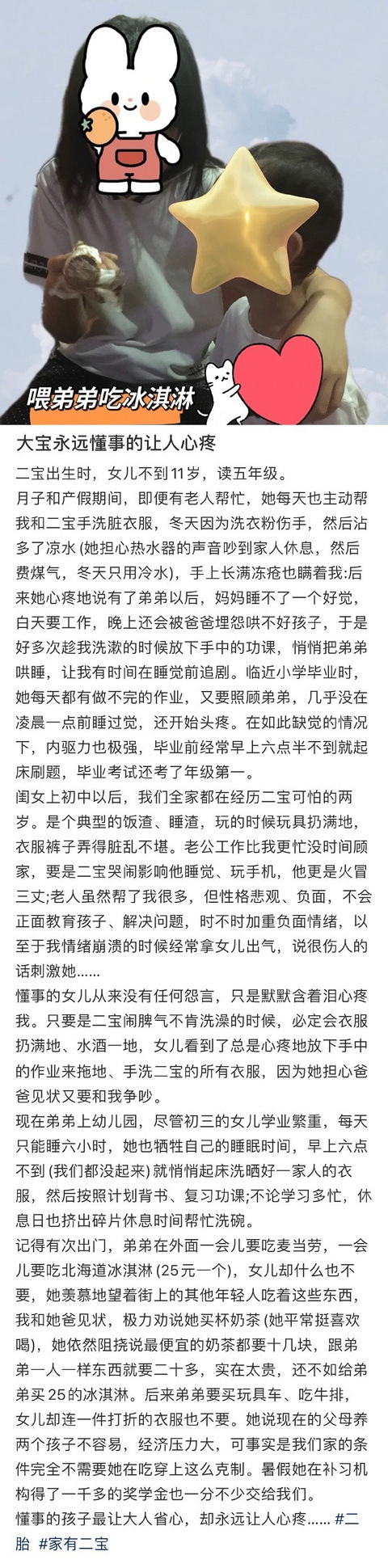打开微博,看见一位二胎宝妈发长文,炫耀自己的大女儿懂事得令人心疼。1、妈妈坐月子期间,主动用冷水手洗妈妈和二宝的脏衣服,洗到手上长满冻疮。 2、心疼妈妈带孩子睡不好觉,多次主动放下功课,提前把弟弟哄睡,让妈妈有空闲在睡前追剧。 3、因为二胎压力和家庭矛盾,做妈妈的会经常拿女儿出气,但她从未有任何怨言,依旧默默地帮助妈妈做家务。 4、即使上初三学业繁重,每天只能睡6个小时,还是会牺牲自己的睡眠时间,