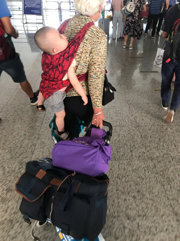 动车上的老人,看着很心酸,头发全白背着娃拿行李赶车
