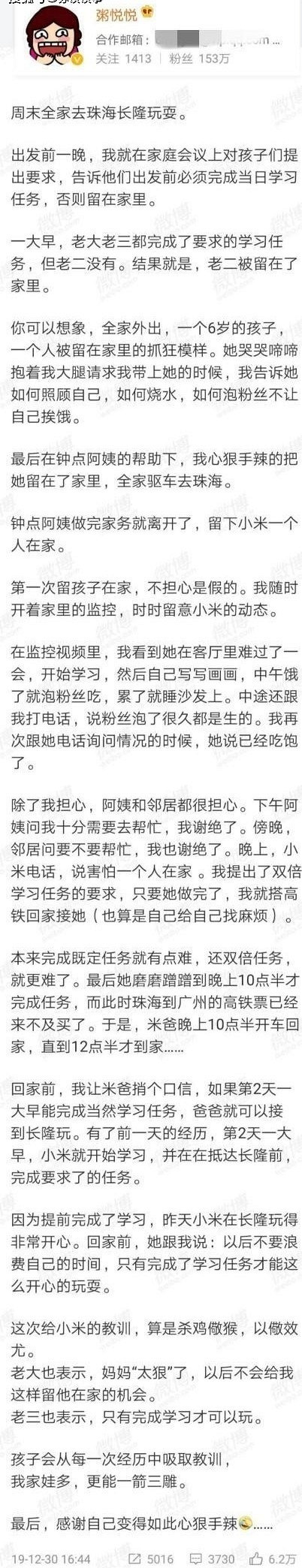 最近育儿大V“粥悦悦”被骂上热搜事情是这样的,源于粥悦悦发的一则微博。2019年的最后两天,她们全家打算去珠海长隆玩,家里三个孩子中的老二没有按时完成作业,所以按照他们之前的约定,其他家人开车去了珠海长隆,而只把6岁的二女儿留在了家里。粥悦悦在微博里表示,不担心孩子的安全是假的,她随时开着家里的监控时刻留意女儿的动态。中途女儿打电话说泡很久都是生的,但是她吃饱了。阿姨和邻居都很担心,都表示要不要