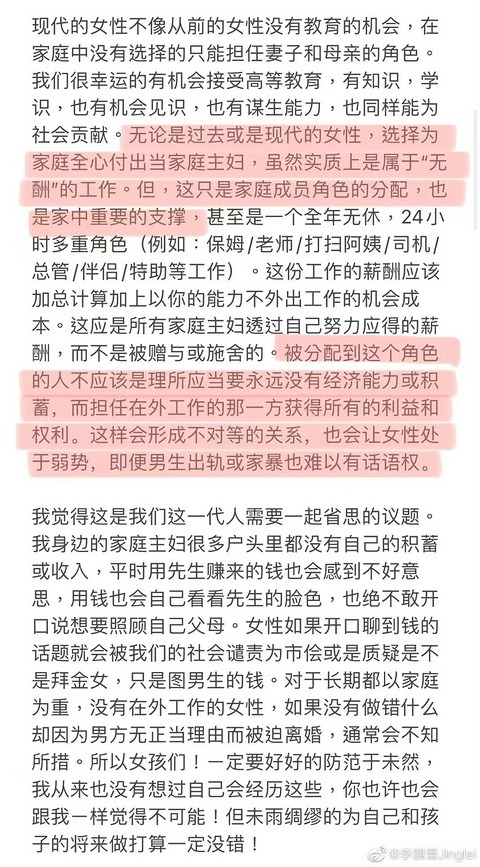 吃瓜归吃瓜……李靓蕾说到全职主妇这个点的时候,有触及到我,结婚前谁不是独立、自主、闪闪惹人爱的小公主?结婚后所有女性都要强制成长,每天除了工作就是带娃、做家务、处理琐事,这些好像就是妈妈的事。 最开始在家带娃的时候,白天没有人跟你说话,晚上好不容易等到老公回家,想聊聊,人家根本不理你,没有钱花了低声下气问老公要,心里也会觉得很委屈,怎么婚后生活会变更这样……李靓蕾还被沦为生育机器,跟着王力宏的时