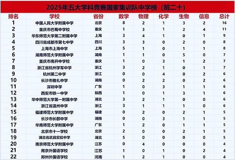 11月30日随着第41届全国中学生数学奥林匹克竞赛(决赛)落下帷幕2025年度全国五大学科竞赛国家集训队名单出炉今年五大学科竞赛中全国共有260名优秀学子脱颖而出入选国家集训队其中重庆学生共有22人他们也同时获得保送清华、北大的资格 目前,全国白名单学科竞赛为全国中学生数学、物理、化学、生物和信息学五大学科竞赛,通过省级竞赛、全国竞赛等环节,最后产生国家集训队名额。 根据公布的名单,2025年
