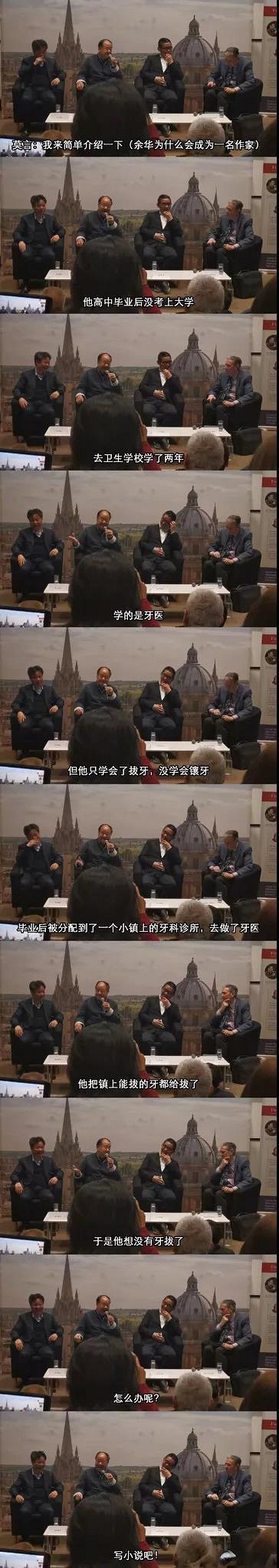 莫言在接受采访时说:我来简单介绍一下(余华为什么会成为一名作家)。 他高中毕业后没考上大学,去卫生学校学了两年,学的是牙医,但他只学会了拔牙,没学会镶牙,毕业后被分配到了一个小镇上的牙科诊所,去做了牙医。 他把镇上能拔的牙都给拔了,于是他想没有牙拔了,怎么办呢?写小说吧! (左一为余华) 最近在读余华的书。他的作品对我来说是最具鲜明情感的,有的作品可以哈哈大笑,有的作品黯然泪流,有的作品揪心揪肺,