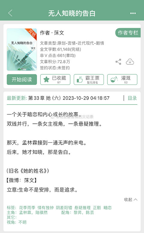 《无人知晓的告白》莯文 很好看的悬疑短篇,很推荐这本,好看的!故事虽然篇幅短,但是很完整紧凑,每个角色都很鲜活,双线并行,一条女主视角,一条悬疑推理,环环相扣,没有废话。 故事开头就是男主去世,警察通过蛛丝马迹寻找嫌疑人。女主这边她接到一个没有声音的电话,她以为是恶作剧没有放在心上。她翻到了一些过去的东西,回忆起高中那些记忆,那些关于尘封已久的那个男孩的记忆也渐渐浮现在脑海。 现实和女主的回忆重叠
