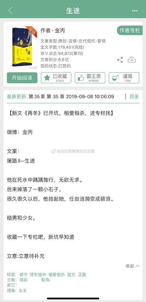 说到人间烟火气不得不提到一个作者——李尾,她的三本小说《情人》,《我叫王西平》《但愿人长久》平凡又接地气,每本都爱。 这一类型必须拥有含胭的姓名,她最近连载的《唐小姐已婚未育》写的好真实,包括她的《幻梦成真》《空心人》和《鸵鸟先生》那几本残疾男主也大部分都是这一类的。 其实早期的金丙也写过几本这样类型的文,她的女主都有一股独特韧劲,《生途》和《春起》 另外提名几本最近看过的这类小说 《人间大火》缪
