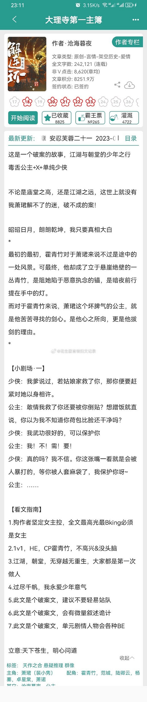 《大理寺第一主簿》沧海暮夜 热血少年群像文,很好看!和《银鞍白马度春风》是同一个作者。 男女主一个是没头脑单纯游侠,一个是不高兴的毒舌公主,因为一起案件而相遇,女主聪敏机智,身为大理寺主簿很快就查明了真相,还男主清白,男主也因此赖上了她。在探案的过程中,女主结识了很多小伙伴,为了寻求真相,解迷破案,一起游走于江湖和朝堂之中。 可惜还在连载,作者说一共要写九个案子,大概要写四十万字,现在已经写完第四