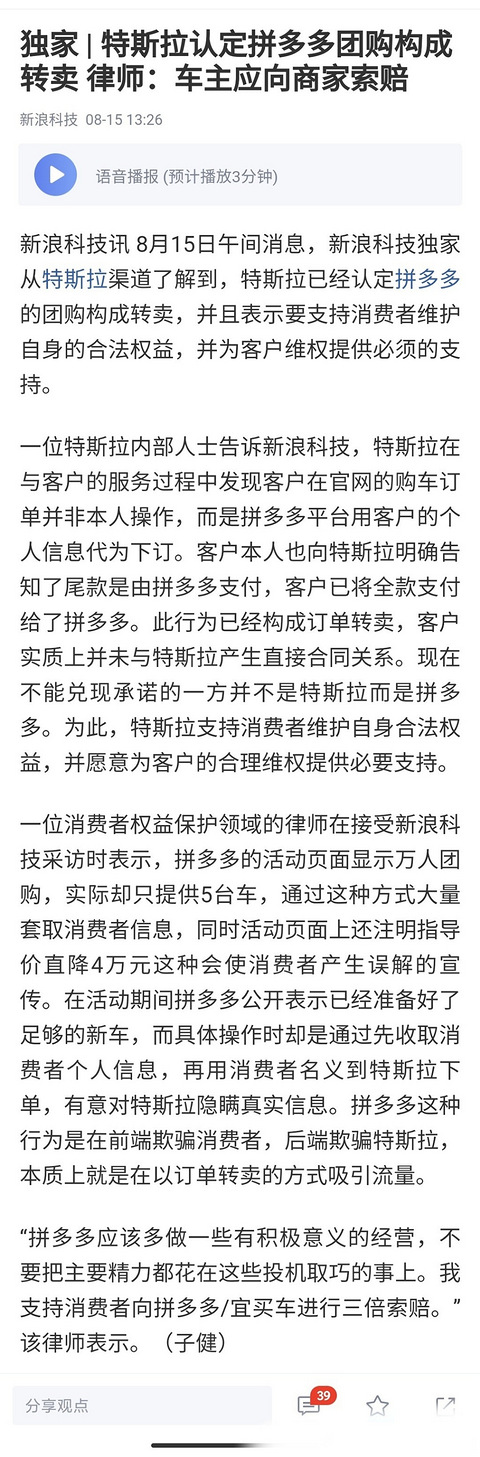 特斯拉认定拼多多团购构成转卖# 律师:车主应向商家三倍素赔