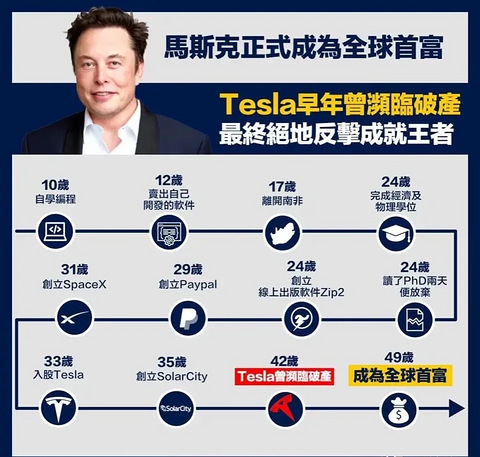特斯拉老板马斯克成为全球首富。钢铁侠传奇人物的经历