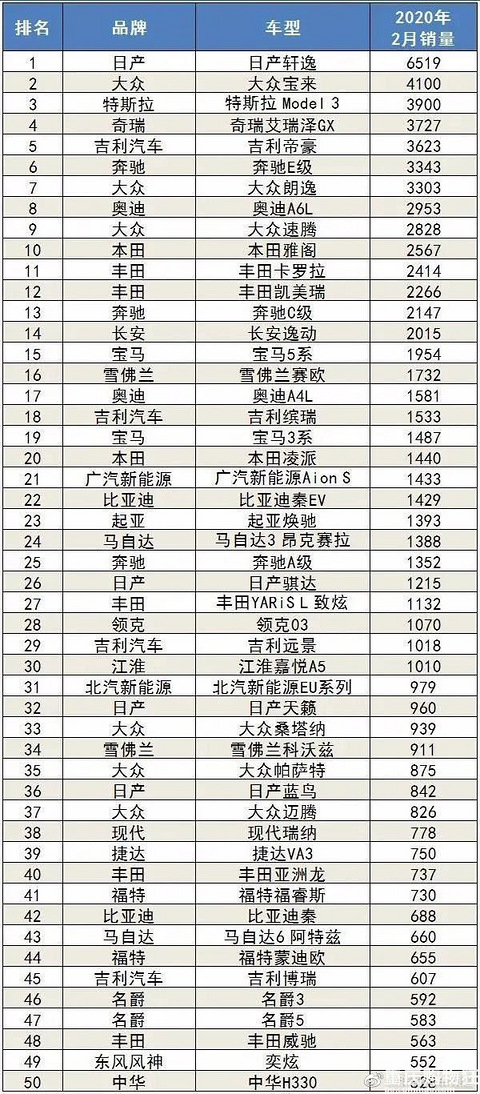 2020年2月轿车销量排行。特斯拉这卖得可以啊疫情期间,大家销量都下跌得十分明显,看看四五月份的销量吧,大概就能看出哪家车企应对当下疫情局势的行动最有效果了