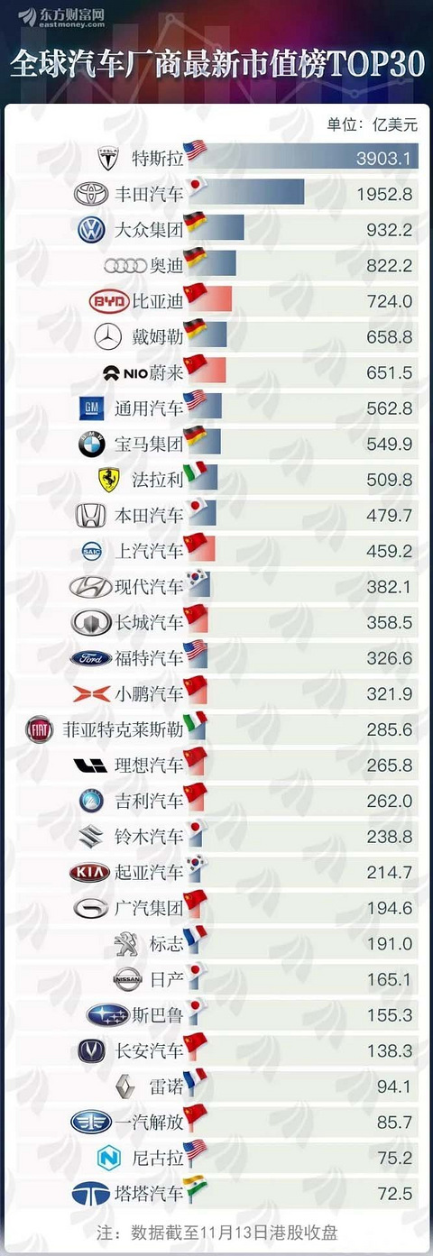 特斯拉市值=丰田+大众+宝马+奔驰......多数人可能没意见,但这个名单中,如果特斯拉的位置换成比亚迪、蔚来、理想、小鹏汽车呢,有多大的信服力? 最新数据显示,比亚迪比奔驰更高,蔚来的市值已经超过了宝马、通用、法拉利,小鹏和理想将日产、雷诺都抛在了身后,要说这些都代表了中国新能源造车势力的真实实力,这些厂商自己恐怕都不相信。