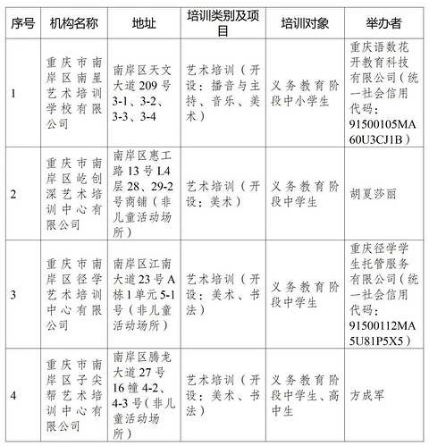 根据《重庆市非学科类校外培训机构设置标准和管理指南(试行)》《重庆市非学科类校外培训机构审批流程(试行)》等相关规定,经材料审核及办学条件现场核验,拟同意设立重庆市南岸区南星艺术培训学校有限公司等4家机构,现依规予以公示: 公示期为五个工作日:2025年10月20日—2025年10月24日。公示期间如有异议,请向南岸区教委反映,举报请使用真实姓名及联系方式,匿名举报不予受理。 联系电话:023-