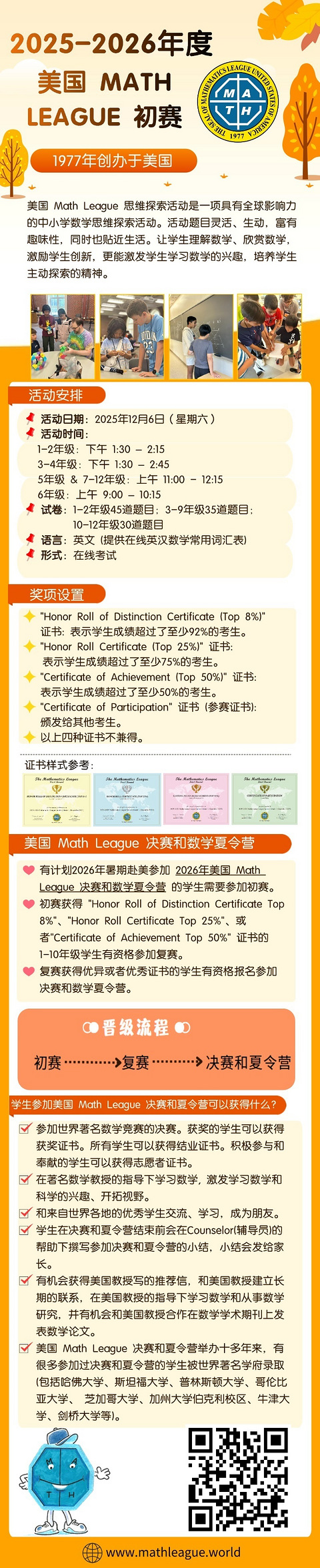 既想让孩子感受数学竞赛的魅力与乐趣,又怕高难度题目挫伤他们的积极性与自信心? 那肯定首选美国数学大联盟(Math League)。作为一项极具全球影响力的中小学思维探索活动,巧妙地将英语与数学结合,深受家长与学生的关注。因其独特魅力,“大联盟”在众多家长心中占据着举足轻重的地位。 Math League在11月26日就要截止报名了,想要让孩子体验的家长千万别忘记报名哦!报名后即可领取真题,早报名早