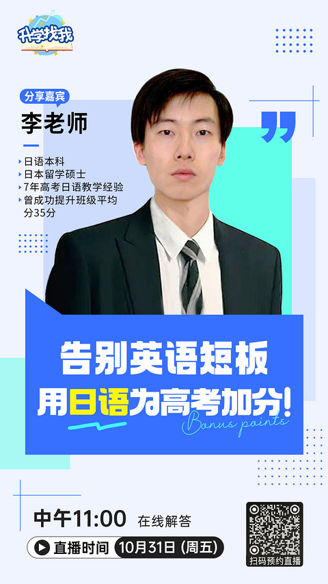 孩子每天花大量时间背单词、学语法,但英语成绩始终不见起色,甚至成为拖累总分的“短板”?面对千军万马过独木桥的高考,一分之差就可能与理想大学失之交臂。 现在有一条更稳妥、更高效的路径,能让孩子 “弯道超车” ,【高考日语】正成为越来越多明智家长的“秘密武器”! 高考外语 ≠ 只有英语!直播中,将权威解读高考政策允许选择日语作为外语科目,与英语具有同等效力! 以及真实案例,历年选择日语高考的学子如何成