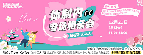 婚恋市场中的第一梯队是什么职业呢?公务员?老师?医生?父母眼中的“铁饭碗”是什么职业呢?公务员?公务员还是公务员? ▼ 公教医等单位的从业人员也是福利好待遇好、工作稳定的代名词为了提高匹配度和精准交友这次特意为大家带来了“体制内”专场 ▼ 12/21 相约渝中时代天街C馆两点咖啡 一场公教医等体制内专场联谊在等你这也是我们今年举办的第14场体制内专场哦 举办单位:重庆购物狂举办时间:12月21日