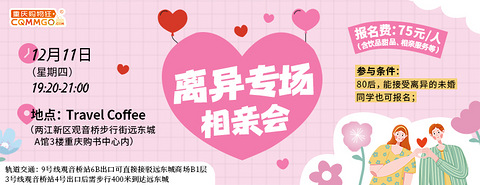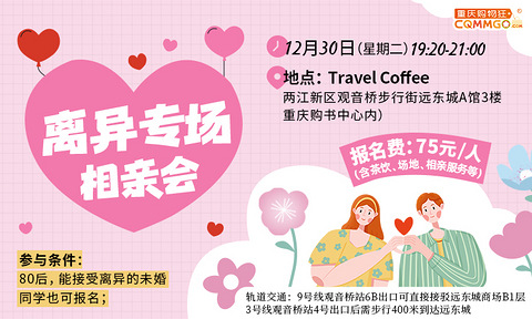 年龄好像中催着我们往前走不知不觉中90后已经过半迈入而立之年了 ▼ 为了提高匹配度和精准交友这次特意为大家带来了“90后专场” 脱单一定要趁早呀 ▼ 11/28 相约观音桥远东城Travel Coffee一场90后精准交友在等你 主办单位:重庆购物狂 举办时间:11月28日(星期四)19:20-21:00 举办地点:Travel Coffee(江北区观音桥东环路远东城A馆3楼重庆购书中心内) 轨
