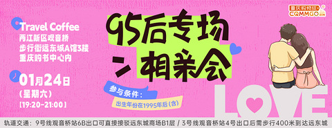 岁月弹指老相爱要趁早 ▼ 新年新气象马上有对象 ▼ 01/24 相约观音桥远东城Travel Coffee一场95后精准交友在等你 主办单位:重庆购物狂 举办时间:01月24日(星期六)19:30-21:00举办地点:Travel Coffee(两江新区观音桥东环路远东城A馆3楼重庆购书中心内) 轨道交通:9号线观音桥站6B出口可直接接驳远东城商场B1层 3号线观音桥站4号出口后需步行400米