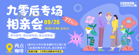 年龄好像中催着我们往前走不知不觉中90后已经过半迈入而立之年了 ▼ 为了提高匹配度和精准交友这次特意为大家带来了“90后专场” 脱单一定要趁早呀 ▼ 09/26 相约时代天街C馆两点咖啡一场90后精准交友在等你 主办单位:重庆购物狂举办时间:09月26日(星期四)19:20-21:00 举办地点:两点咖啡馆(渝中区大坪正街龙湖时代天街C馆G层重庆购书中心内,优衣库楼下) 轨道交通:1号线石油路站