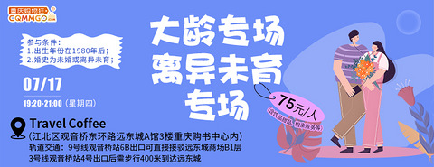 你或许是个有故事的人独自彷徨等待多年只为邂逅同频的ta ▼ 你或许曾经有过一段婚姻虽然迷了路,但仍然相信爱情只为遇到携手一生的人 ▼ 时光如飞刀,我们都经历过许多人和事褪去了青涩懵懂,变得沉稳理性但更懂珍惜,因为我们依然期待并且相信爱情这一次,让我们一起期待“第二春”的重启吧 主办单位:重庆购物狂 举办时间:07月17日(星期四)19:20-21:00 举办地点:Travel Coffee(江北