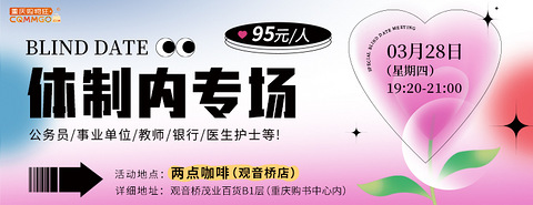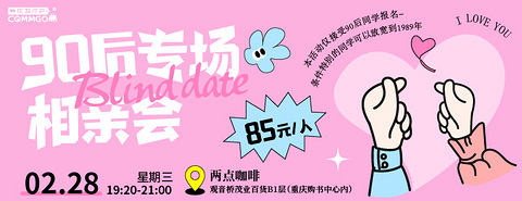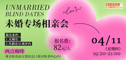 更新了部分男女嘉宾的照片若想打望,请戳 年龄好像中催着我们往前走不知不觉中90后已经过半迈入而立之年了 ▼ 为了提高匹配度和精准交友这次特意为大家带来了“90后专场” 脱单一定要趁早呀 ▼ 02/28 相约观音桥步行街两点咖啡一场90后精准交友在等你 主办单位:重庆购物狂 举办时间:2月28日(星期三)19:20-21:00 举办地点:观音桥茂业百货B1层两点咖啡(重庆购书中心内) 详细地址:重