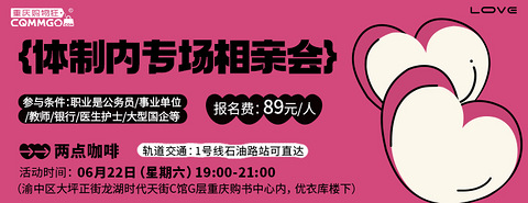 重要通知:本周六6月22日的体制内专场可接受男嘉宾现场报名有空的男士可直接前往现场报名哦 —————— 婚恋市场中的第一梯队是什么职业呢?公务员?老师?医生?父母眼中的“铁饭碗”是什么职业呢?公务员?公务员还是公务员? ▼ 公教医等单位的从业人员也是福利好待遇好、工作稳定的代名词为了提高匹配度和精准交友这次特意为大家带来了“体制内”专场 ▼ 06/22 相约时代天街C馆两点咖啡一场公教医等体制内