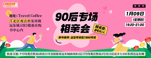 今晚的90后专场可接受男女嘉宾现场报名符合要求的直接来报即可 —————— 年龄好像中催着我们往前走不知不觉中90后已经过半迈入而立之年了 ▼ 而且距离春节只有20天了90后们也要长一岁了所以 脱单一定要趁早呀 ▼ 01/09 相约观音桥远东城Travel Coffee一场90后精准交友在等你 主办单位:重庆购物狂 举办时间:01月09日(星期四)19:20-21:00 举办地点:Travel