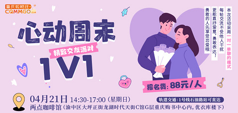 更新了部分妹子的照片欢迎围观ing 春意渐浓 到处洋溢着粉红色的甜蜜气息世间很多美好的情缘都源于一场一场的相遇 ▼ 区别于其他的专场相亲会本次活动采用一对一的模式 每轮交流不受他人干扰 更能直抒爱意,勇敢表达! 勇敢的人先享受恋爱哦 ▼ 04/21 相约渝中区时代天街C馆两点咖啡遇见春天遇见你,让你心动“狂飙” 主办单位:重庆购物狂 举办时间:04月21日(星期日)14:30-17:00 举办